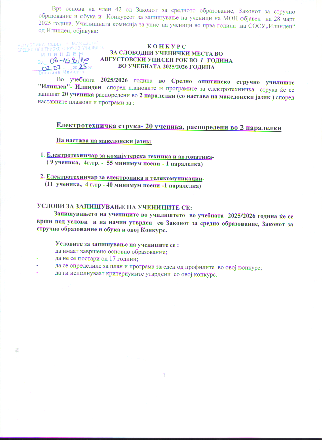 Во учебната 2025/2026 година во Средно општинско стручно училиште “Илинден”- Илинден според плановите и програмите за електротехничка струка ќе се запишат 20 ученика распоредени во 2 паралелки (со настава на македонски јазик) според наставните планови и програми за: